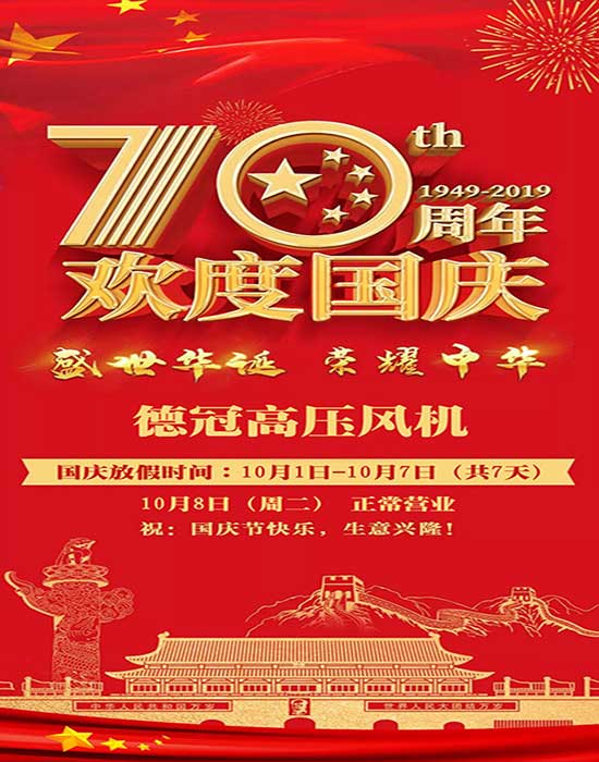德冠品牌高壓風(fēng)機(jī)公司國慶放假七天,祝大家國慶節(jié)快樂!生意興??!新老客戶做好備貨工作,以防耽誤自己的正常生產(chǎn)!